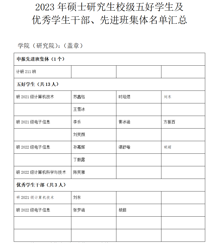 根据研究生处下发的《关于评选表彰2023年硕士研究生校级五好员工、优秀员工干部、校级班集体的通知》,共评选出优秀班集体1个,优秀员工干部3人,五好员工13人,评选名单已经上传,公示期为2023年11月10日-2023年11月17日,监督电话037162506615,有异议者可以在公示期内实名反馈。