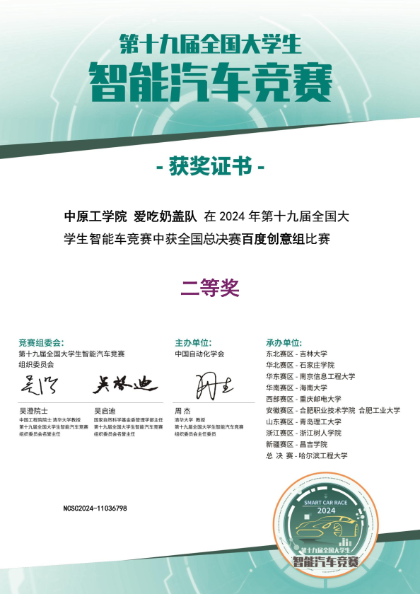 2024年8月22日,由中国自动化学会主办的第十九届全国高校智能汽车竞赛总决赛在哈尔滨工程大学圆满闭幕。总决赛共有来自清华大学、华中科技大学、哈尔滨工业大学、北京航空航天大学等在内的全国236所高校、550支队伍,分12个组别开展同台竞技。db体育员工邹啟华、曾令洁、朱志远和自动化与电气工程公司员工许育通、张涵煜组成的“爱吃奶盖队”参加了百度智慧交通创意组竞赛,db体育教师张慎武和许进忠担任指导教师。经过激烈角逐,“爱吃奶盖队”在第一天摄像头连线意外折断的不利情况下,沉着冷静地解决问题,最终以优异的成绩获得国家二等奖。这是公司学子第一次参加该项赛事。